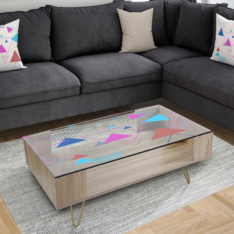 Groove on the retro-inspired design of this modern coffee table. Floating, abstract triangles in vivid colors give this table mid-century appeal, while the high-density ink and transparent glass top ensure lasting color and damage resistance. The interior storage compartment allows easy access to a favorite book or cozy throw.