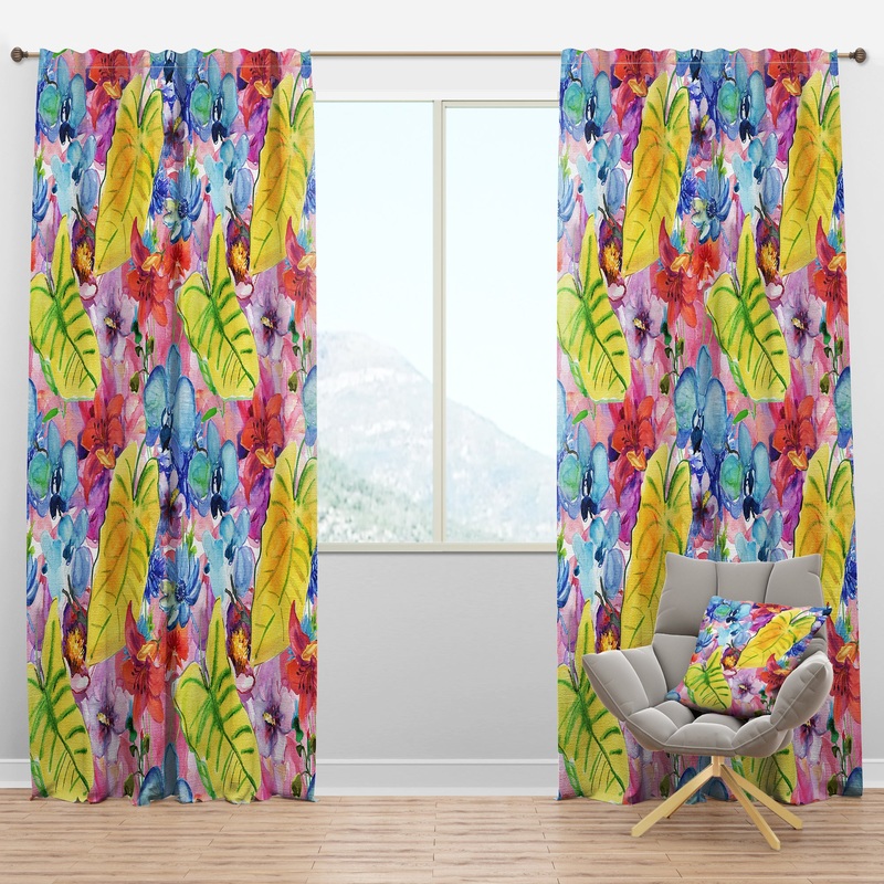Enliven your living space with this Designart floral curtain panel. Large-scale yellow leaves pop between red and blue flowers, instantly brightening your room. Made from polyester fabric, these curtains provide thermal insulation and reduce noise from the outdoors for a warmer, cozier environment.