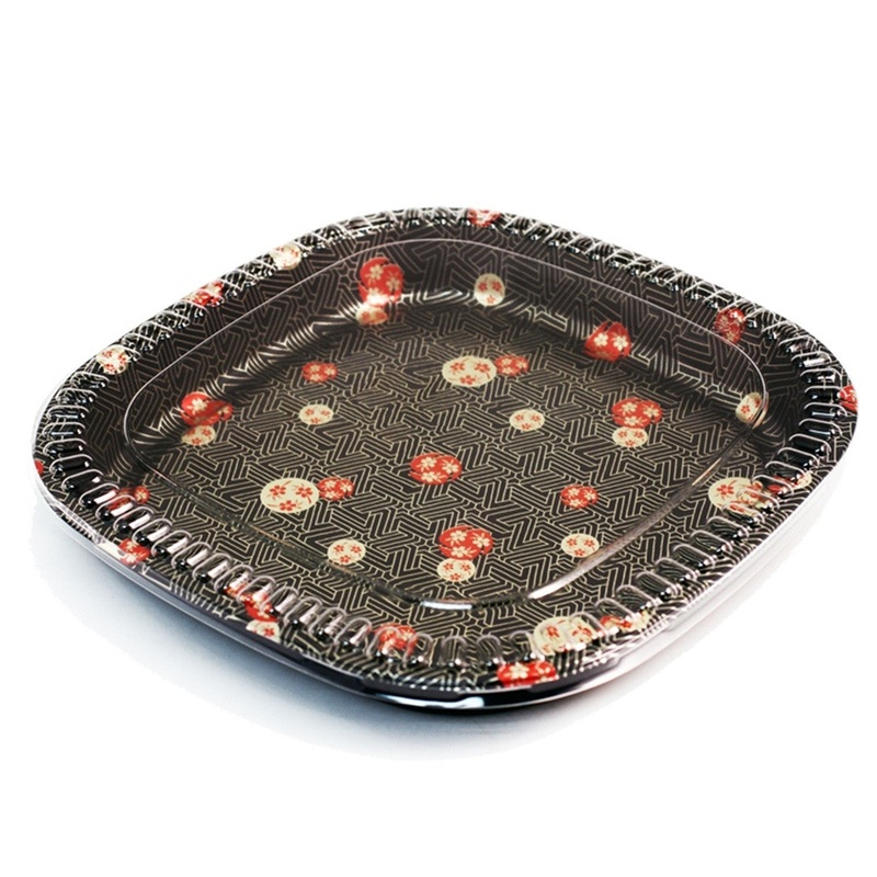 These rounded square take-out containers with simple Japanese designs are ideal for catering. Transport and display sushi or other food items on these trays. Garnish with baran decorative plastic grass to complete the presentation.SpecificationsMaterial: P