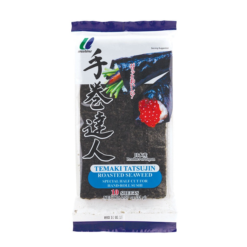 Roasted seaweed cut for temaki or hand roll sushi. SpecificationsManufacturer: UrashimaIngredients: Seaweed, Soy Sauce(Water, Soybean, Salt, Wheat), Sugar, Chili Pepper, Monosodium Glutamate.10 Sheets, 0.37 oz (11g)Country of Origin: United StatesShelf Lif