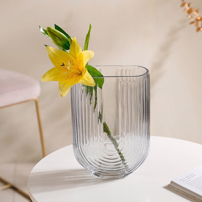 The uniquely shaped vase features a ribbed textured surface and a subtle grey tint to make a lovely addition to any living room decor, adding a refreshing touch. The flower vase features a textured glass design with flawless finishing, making the glass flower vase a stylish piece to place beside the sofa or on the coffee table. The vase’s glossy finish makes it an elegant option for displaying fresh or artificial flowers, while the textured surface of the vase adds to its eye-catching appeal as an accent piece to elevate the home decor in totality.
