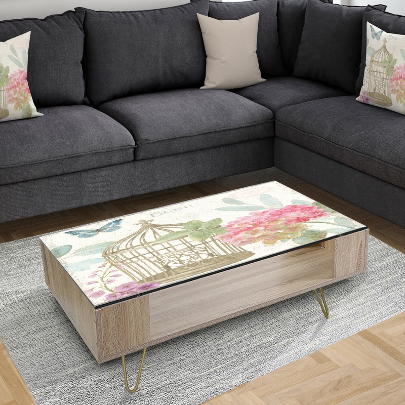 Decorate your living room with the vintage birdcage and beautiful blooms depicted on the glass table top of this traditional coffee table. Featuring an open shelf, this coffee table is perfect for displaying your favorite books and sculptural pieces. Gold metal legs provide sturdy support.