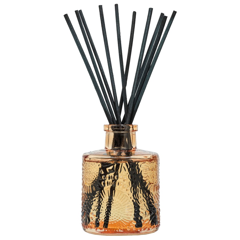Limited Edition Fragrance Family: Warm & SpicyScent Type: Warm & Sweet GourmandsKey Notes: Fresh Kabocha Pumpkin, Fluffy Vanilla Marshmallow, Whipped Coconut Crema, Cinnamon Spiced BruleeDiffuser Length:Four to six monthsFragrance Description: Cozy up to autumn with Voluspa’s Spiced Pumpkin Latte. Fresh kabocha pumpkin is brewed with warm spices, creamy coconut milk, and a kiss of fluffy vanilla marshmallow. It’s the scent of the seasondrink it in.About the Diffuser:The fragrant diffuser oil is hand-poured into embossed glass for a subtle pop of elegant dcor. Create your home’s signature, always-on fragrance in spaces requiring minimal effort, and enjoy for four to six months. It includes rattan reeds for powerful fragrance without overwhelming. Coconut Oil, 3-Phenyl-1-propanol, Cinnamaldehyde, Eugenol, Alpha-Methylcinnamaldehyde, Coumarin, p-Methoxybenzaldehyde, Ethyl Vanillin, Vanillin, Ethyl Maltol, Phenethyl Alcohol, Alpha,alpha-Dimethylphenethyl Butyrate. Suggested Usage:-Remove the stopper and insert reeds.-Always place the diffuser on an oil-resistant surface.-Gently flip reeds weekly to increase fragrance distribution.-For optimal fragrance, allow reeds to absorb fragrance oil for 24 to 48 hours before flipping.-Use the empty vessel to up-cycle and create your own keepsake.