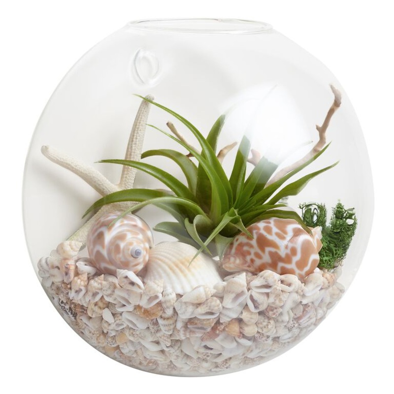 Fix our terrarium to your wall to refresh the look and atmosphere of any room. Featuring a tillandsia succulent and a collection of seashells, pebbles and starfish, this easy-to-maintain mini ecosystem thrives with only a light misting of water every few days.