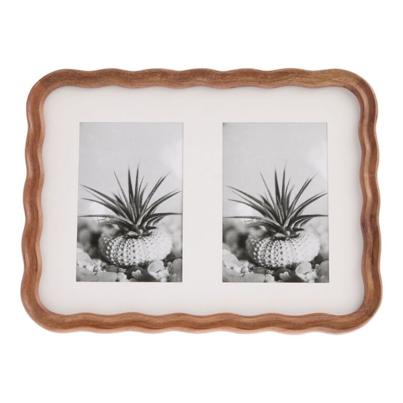 Add a cozy and inviting feel to your home or office with our scalloped double-photo frame handcrafted out of acacia wood with a deep walnut finish. This frame holds two 4×6 photos inside a white mat and can be hung on the wall or displayed on tabletops. The soft rounded edges bring a delightful warmth to your favorite snapshots of family or pets and it also makes a thoughtful gift.