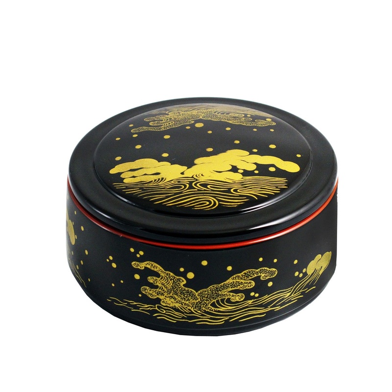 This elegantly decorated faux lacquer box with a lid is typically used to serve chirashi sushi (or scattered sushi).