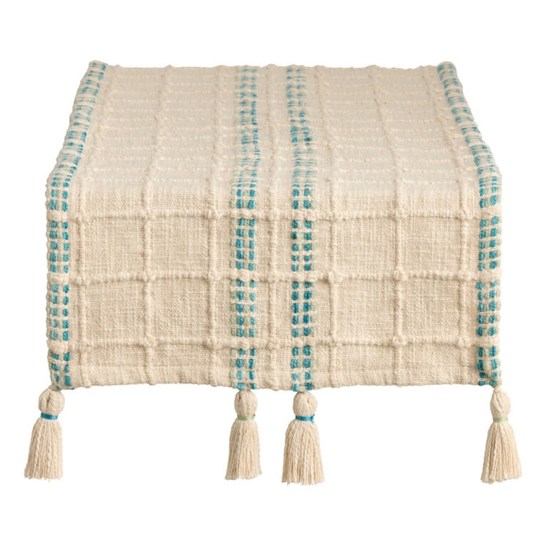 Our exclusive, long table runner brings striking texture to your gathering space with a thick, 100%-cotton weave in off-white with aqua and blue stripes. This boho decor from India adds global glamour to any tabletop with dimensional grid details and oversized tassels on the ends. The simple addition of this runner instantly elevates your dining room for both casual meals and special-occasion entertaining.