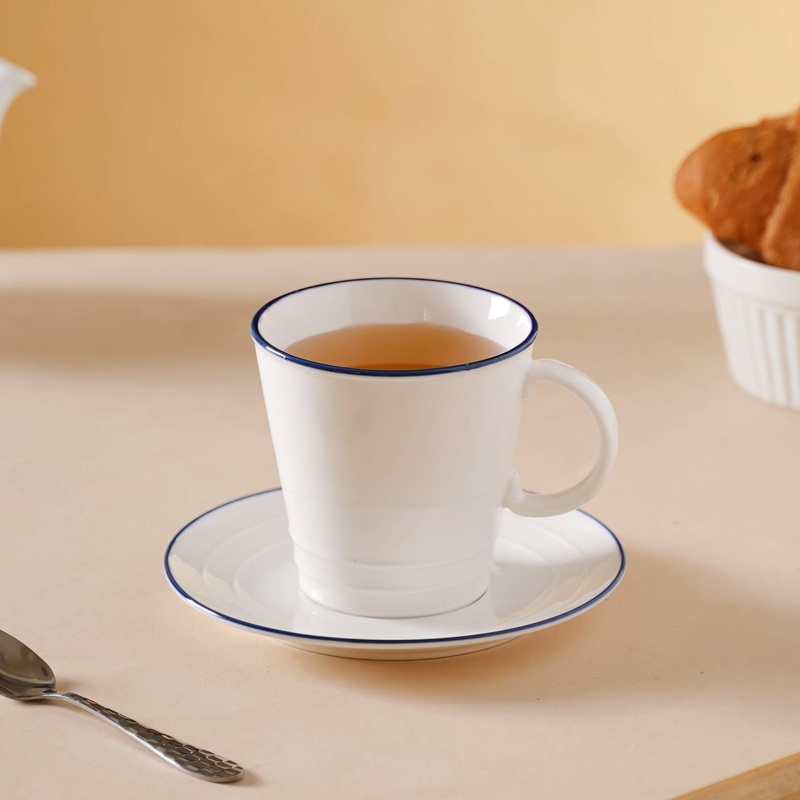 The simple yet elegant mug and plate set in white is apt for presenting on occasions like birthdays or housewarmings. The classic white cup set with a blue border will add elegance and sophistication to a modern table decor.