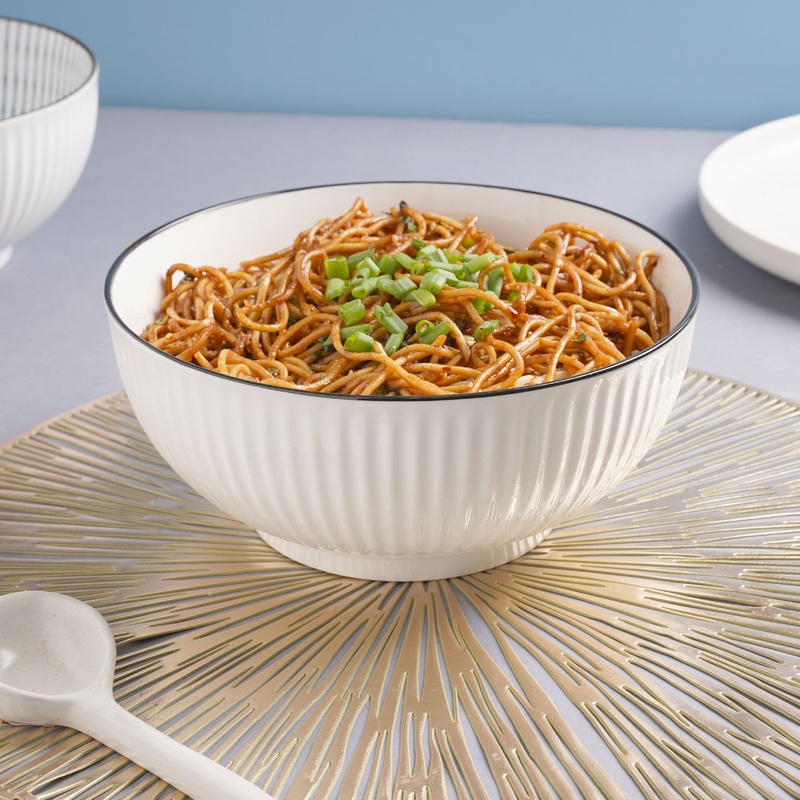 Crafted sleekly with a ribbed pattern and black border, the serving bowl is pristine and sturdy, which makes it a classic addition to any crockery collection. The white base is a perfect background to serve anything. The ceramic serving bowl can be used for birthday parties to highlight party delicacies.