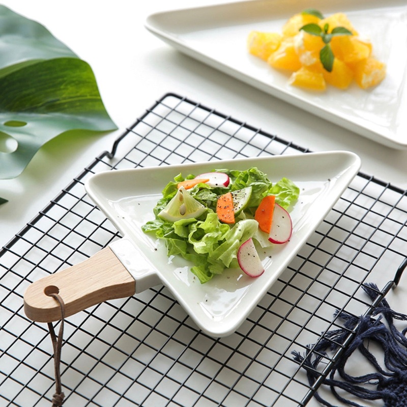 The triangle ceramic plate with a wooden handle can be creatively used to serve up a storm, be it a pizza slice or cookies or even toasted snacks