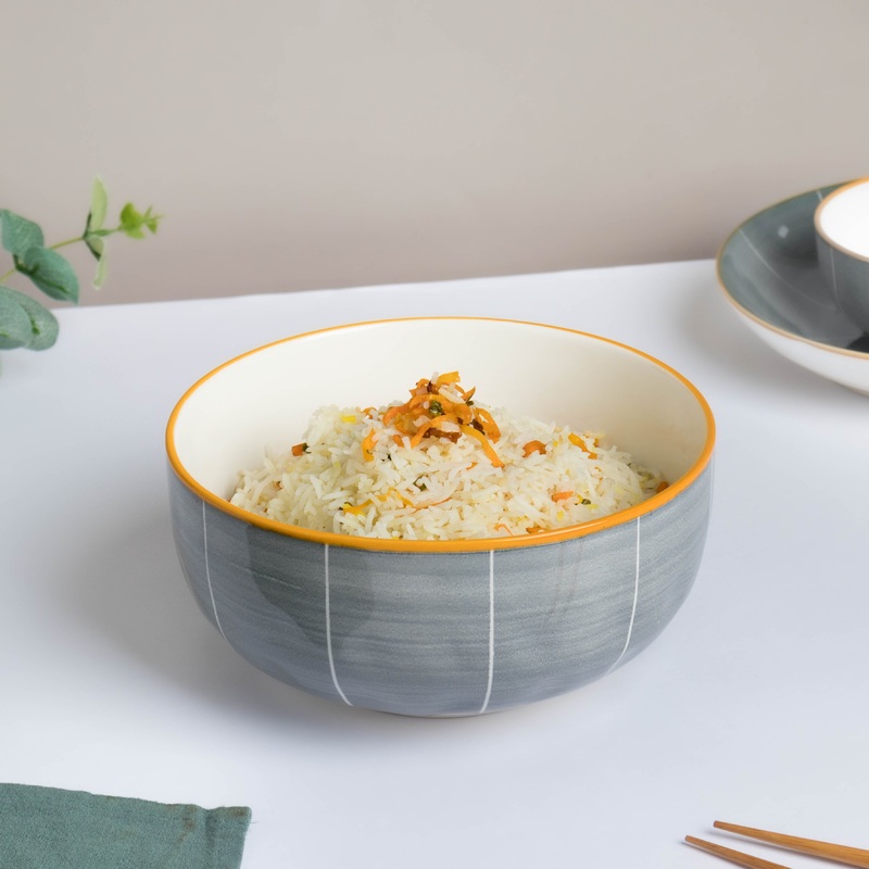 A gracefully shaped bowl for serving the main courses which are the primary attraction of a meal. The ceramic bowl has a patterned blue hue on the outside and is stark white on the inside with a bright yellow rim. Serve rice, noodles, and curry, from the bowl or used to place fresh fruits as the centrepiece of the table.