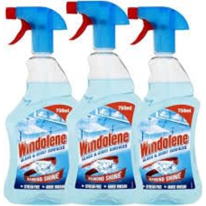 Experience the power of Windolene Glass Cleaner Spray and achieve streak-free shine on all your glass surfaces. This pack of three 750ml bottles ensures you’re always prepared for any cleaning task, whether it’s tackling dirty windows, smudged mirrors, or grimy glass tabletops. Our advanced formula delivers crystal-clear results, leaving surfaces gleaming with a brilliant shine. The easy-to-use spray bottle allows for effortless application, ensuring quick and efficient cleaning without the hassle of streaks or residue. Plus, with its tough-on-grime action, you can trust Windolene to tackle even the most stubborn stains with ease. Choose Windolene Glass Cleaner Spray for a superior clean that’s safe for your home and the environment. INGREDIENTS Anionic surfactants (Contains less than 5 )Trusted brand: Windolene is a trusted name in household cleaning, providing reliable products that deliver exceptional results every time. Pleasant fragrance: Enjoy a fresh and pleasant scent while cleaning, leaving your home smelling clean and refreshed. Residue-free finish: Leaves behind no residue or film, ensuring your glass surfaces stay cleaner for longer. Fast-drying formula: The quick-drying formula means you can enjoy streak-free results in less time, with no need to wait for surfaces to dry. Removes tough stains: Windolene Glass Cleaner Spray effectively cuts through grease, grime, and dirt buildup, leaving surfaces gleaming with a brilliant shine. Easy-to-use spray bottle: The ergonomic design of the spray bottle allows for effortless application, ensuring precise coverage and efficient cleaning. Versatile application: Suitable for use on windows, mirrors, glass tabletops, and more, making it perfect for all your household cleaning needs. Streak-free shine: Say goodbye to unsightly streaks and smudges with Windolene’s streak-free formula, leaving your glass surfaces sparkling clean. Pack of three 750ml bottles: This value pack ensures you have an ample supply of cleaner for all your glass surfaces. Professional-grade formula: Windolene Glass Cleaner Spray is formulated with advanced ingredients to provide professional-level cleaning results.