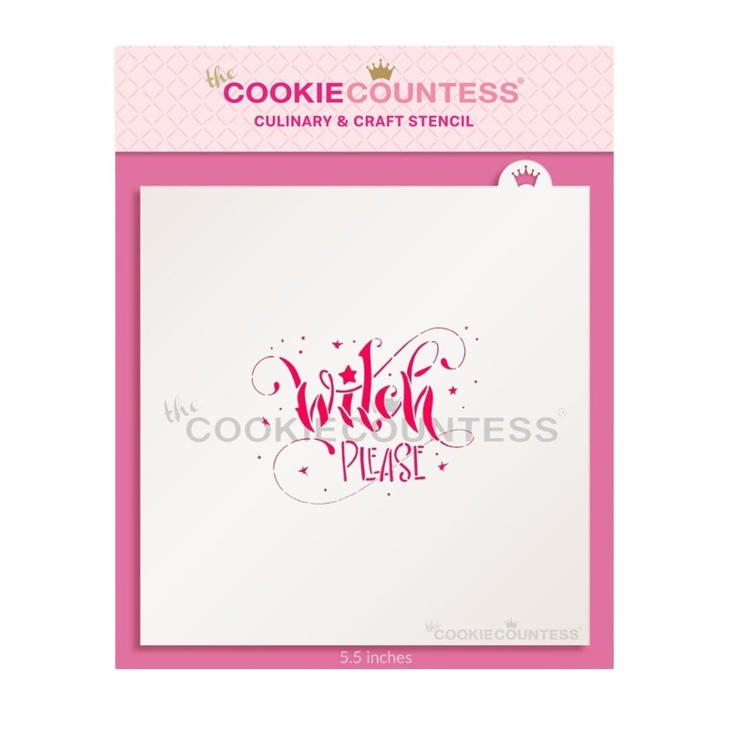 Witch Please stencil. Overall stencil size is 5.5" x 5.5" PINK sections in image are the open sections.Design size2.75 x 2.17"Fits nicely with our Greenwichand Providence PlaquesStencils are 5mil Food Grade plastic, washable and reusable.