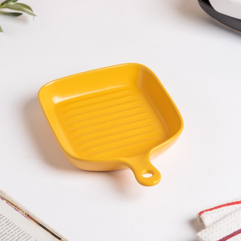 Baking is an art filled with prolific passion and therefore our grill plates are a must-have in any kitchen. The grill plate comes in a bright yellow hue to add a pop of color to the table. Pair complementary pieces from the collection to add to the charm of the one’s setup. The dish with a handle is perfect to cook some baked pasta, lasagna, grilled chicken, or fish, to serve with bread and veggies. The handle of the dish allows easy passing and placing of the dish across the table.