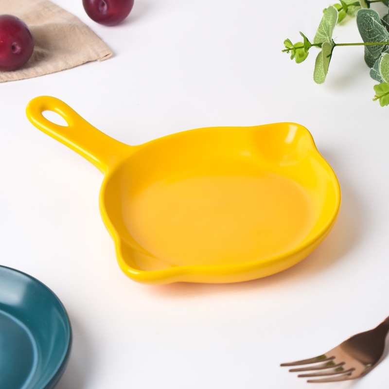Designed as a skillet, the mini baking plate looks spectacular on a quirky table set-up. One can even serve baby food to kids, who will enjoy this bright sunshine yellow shade. The color yellow will tempt the kids to finish the food. The baking plate will double up as snack or appetizer plate.