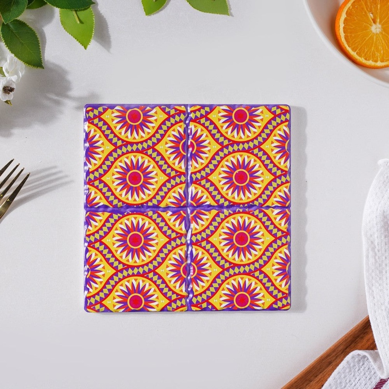 The ceramic trivet has a distinct tiled pattern with an elaborately patterned surface that was influenced by Moroccan art. The trivet, which is made of premium ceramic with a glazed surface and is heat-resistant, is perfect for use with cooking pots that have just been removed from the cooktop. Heat won’t be transmitted to the tabletop thanks to the cork base. Due to its distinctive form, the functional trivet’s colorful design truly beautifies the dinner table.