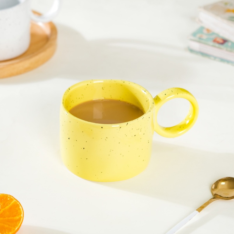 The tiny speckles on the yellow ceramic cup will brighten up the appeal of the crockery. The round speckled cup is a spectacular addition to the crockery collection of any individual who is fond of bright yet subtle shades. The handmade ceramic cup with a