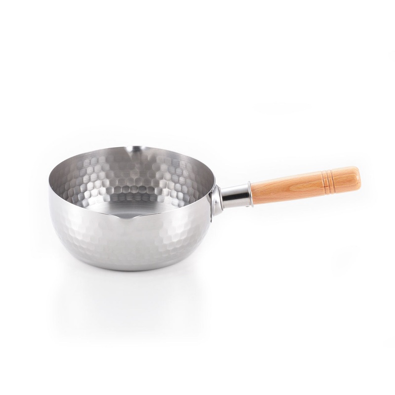 Yukihira pot is a fundamental Japanese cooking appliance and easy to use for everyday cooking. This hammered Yukihira pot, forged from highly durable stainless steel, is ideal for making the perennial favorites of Japanese cuisine such as miso soup and stewed dishes, not to mention the preparation of the all-essential Japanese broth. The dimples that cover Yukihira pots create more surface area on the pot exterior for conducting heat, while on the inside of the pot, the dimples help prevent foods from burning and sticking. The pour spouts make it easy to pour sauce into dishes. Experience the Japanese ambiance passed on from the old days with the easy-to-use Yukihira pot.