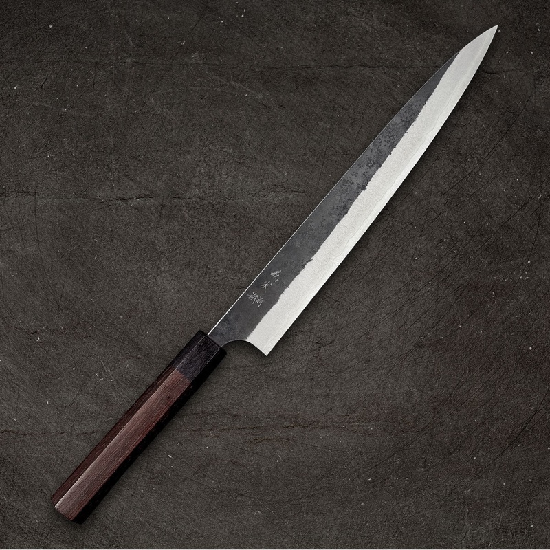 Sujihiki (lit. muscle pulling, meaning muscle or tendon cutter) is the Japanese adaptation of western-style slicers. These knives are made thinner and shorter than chef’s knives, nakiri and santoku in order to minimize friction while slicing meat and fish. Some chefs will use this style of knife to prepare sashimi and sushi in lieu of a yanagi-ba for its favorable maintenance requirements versus single bevel knives.