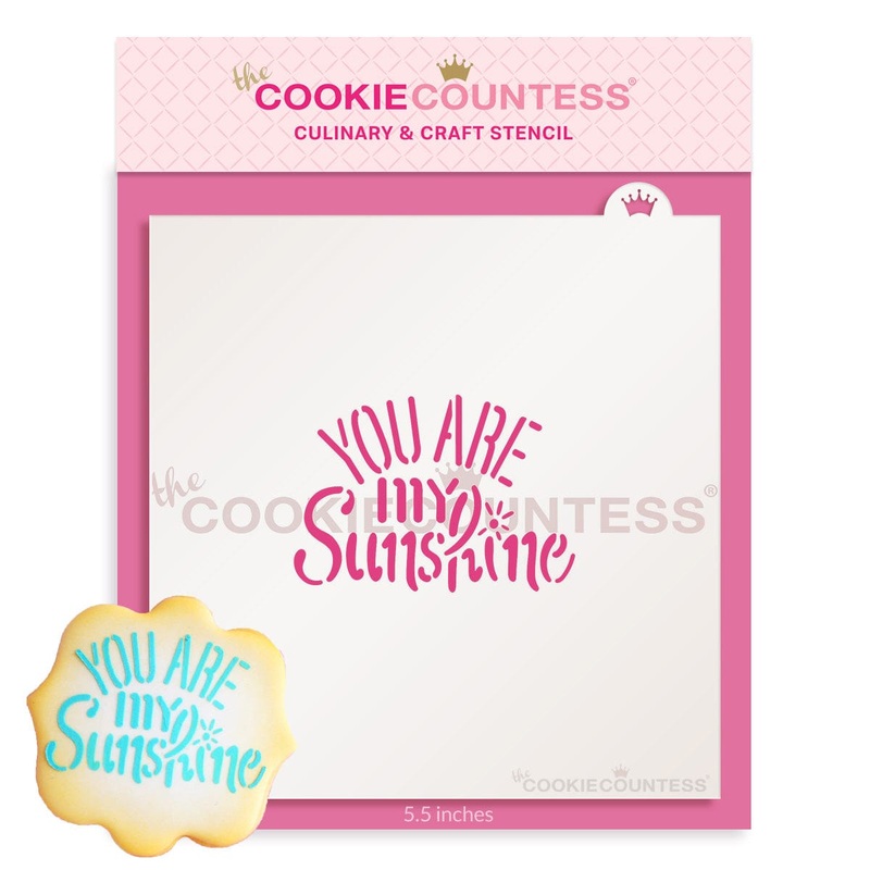 You Are My Sunshine stencil.Design size isapproximately2.6 x 1.9"Overall stencil size is 5.5" x 5.5". PINK sections in image are the open sections. Stencils are 5mil Food Grade plastic, washable and reusable.