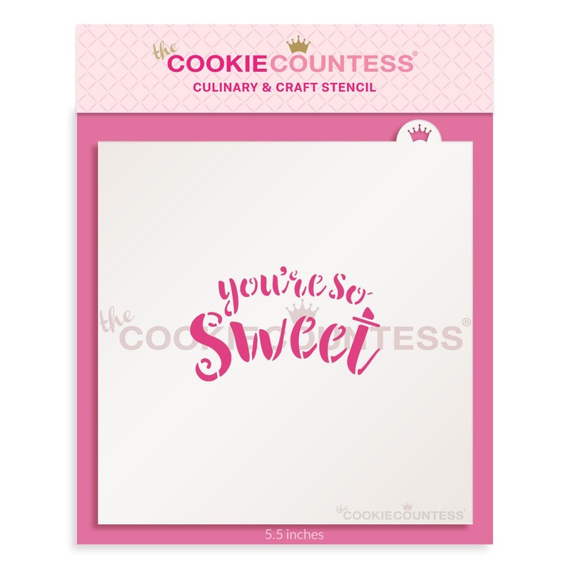 You're So Sweetstencil.Design size isapproximately2.75 x 1.6"Overall stencil size is 5.5" x 5.5". PINK sections in image are the open sections. Stencils are 5mil Food Grade plastic, washable and reusable.