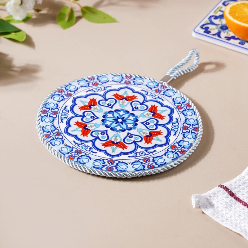 The Moroccan floral design trivet is much more than just an alluring accessory to adorn the table with its vibrant use of colors. The trivet is designed to shield one’s aesthetically pleasing table from unsightly dings and stains brought on by water droplets that collect on the cups’, pots’ and casseroles’ surfaces. The use of contrasting shades of the color wheel to paint the top surface of the trivet add to it a charm akin to age-old Mandala designs that are bound to add serenity to any dining experience. The trivet also features a rope-like loop on one end to hang the trivets after use, designed to save storage space.
