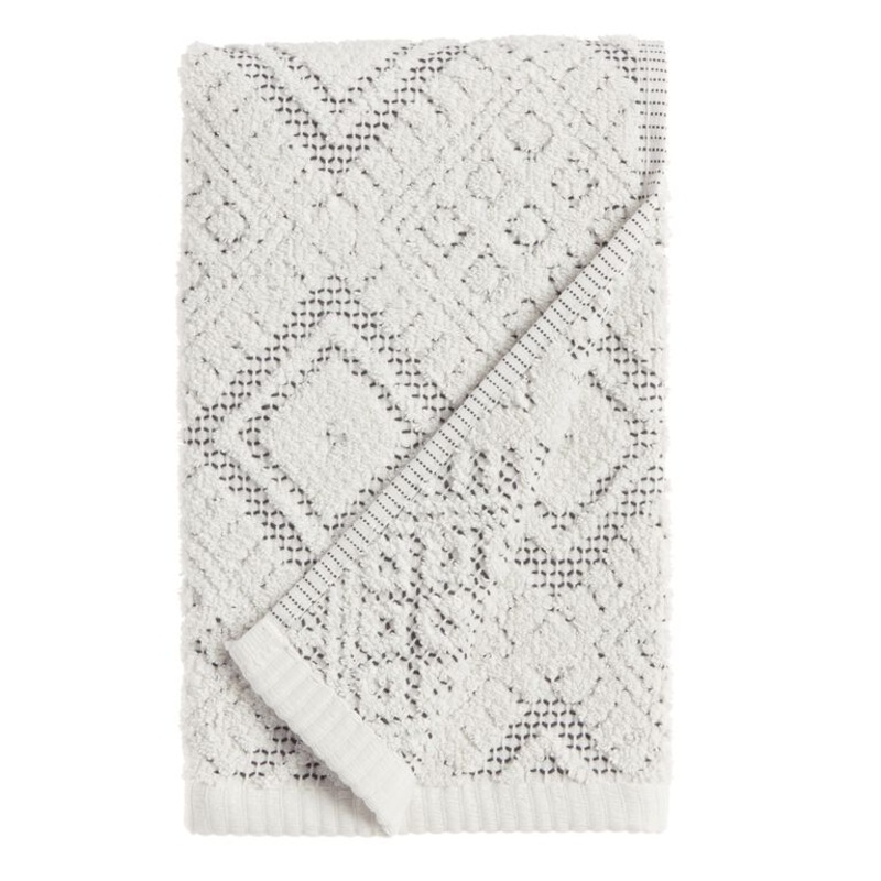 Prized for its incredible softness and superior absorbency, our premium ivory and black Turkish hand towel is made from extra-long cotton fibers. A sculpted diamond pattern and woven honeycomb detailing lend a textural touch.